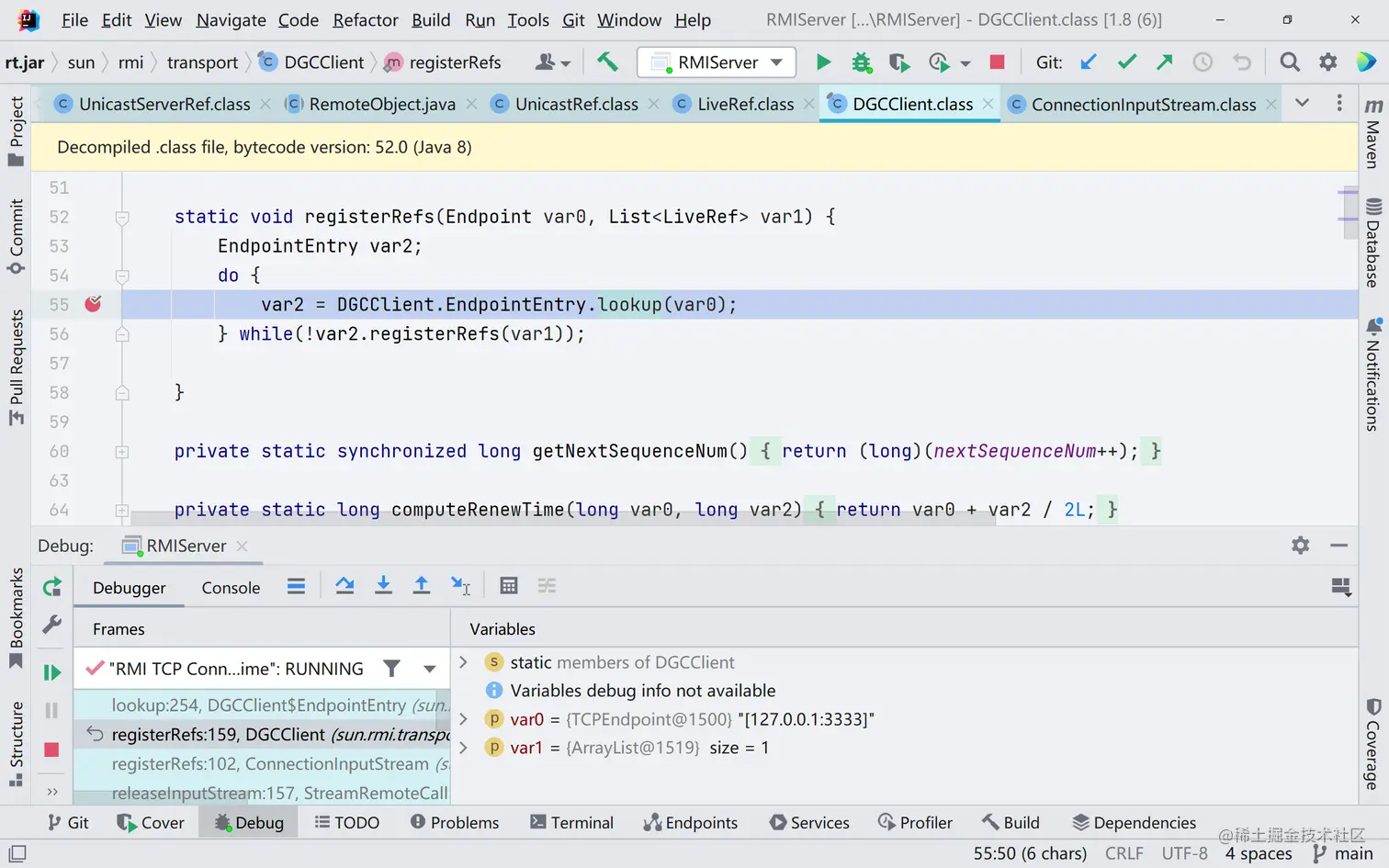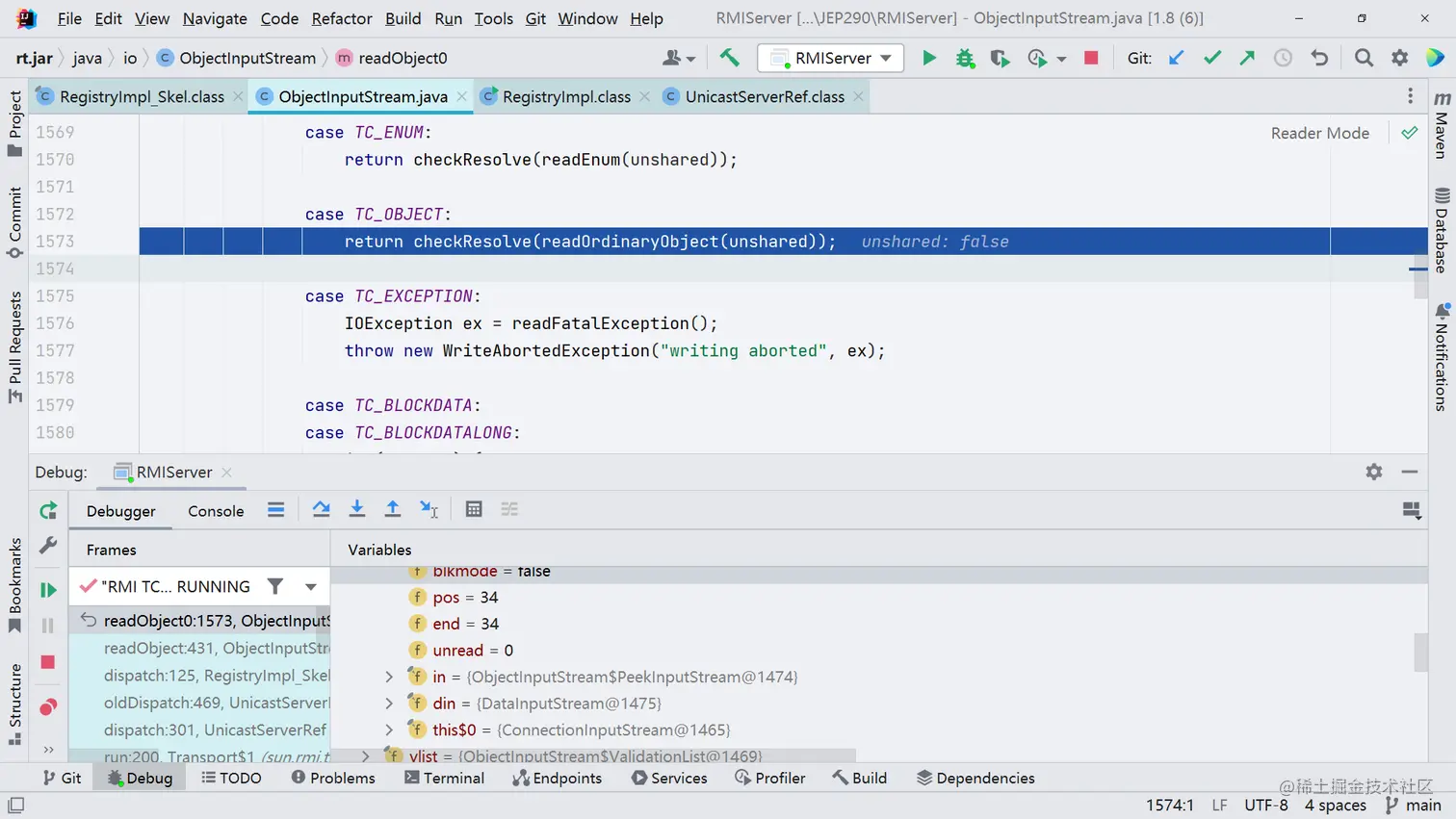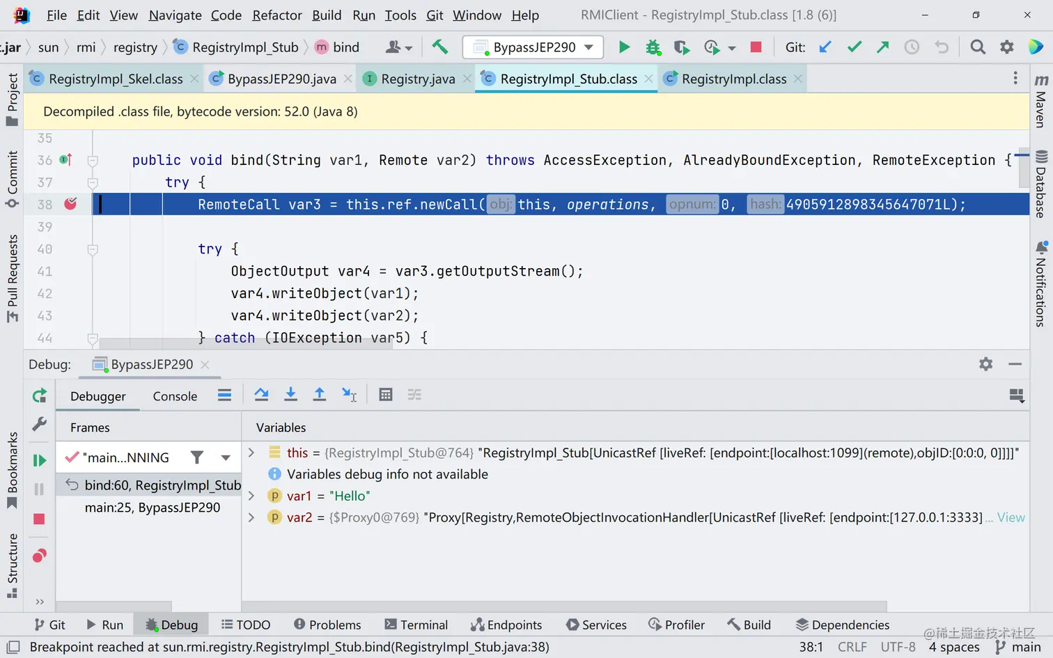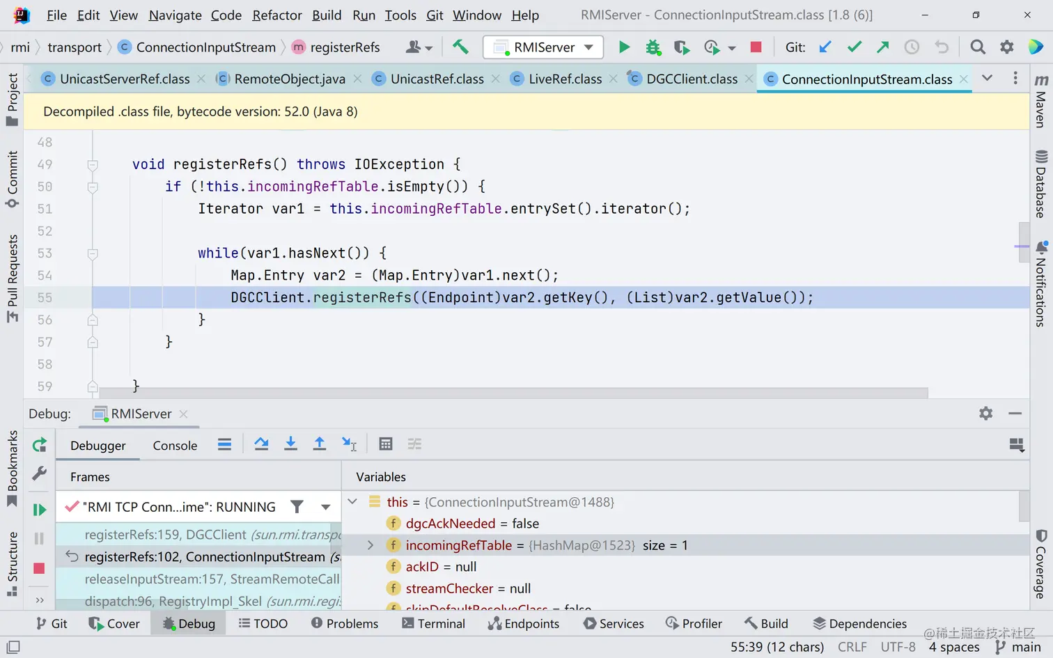 readObject:455, RemoteObject (java.rmi.server)invoke0:-1, NativeMethodAccessorImpl (sun.reflect)invoke:62, NativeMethodAccessorImpl (sun.reflect)invoke:43, DelegatingMethodAccessorImpl (sun.reflect)invoke:498, Method (java.lang.reflect)invokeReadObject:1170, ObjectStreamClass (java.io)readSerialData:2178, ObjectInputStream (java.io)readOrdinaryObject:2069, ObjectInputStream (java.io)readObject0:1573, ObjectInputStream (java.io)defaultReadFields:2287, ObjectInputStream (java.io)readSerialData:2211, ObjectInputStream (java.io)readOrdinaryObject:2069, ObjectInputStream (java.io)readObject0:1573, ObjectInputStream (java.io)readObject:431, ObjectInputStream (java.io) // 从此处开始,会遇到很多字节码不匹配的问题dispatch:92, RegistryImpl_Skel (sun.rmi.registry)oldDispatch:469, UnicastServerRef (sun.rmi.server)dispatch:301, UnicastServerRef (sun.rmi.server)run:200, Transport$1 (sun.rmi.transport)run:197, Transport$1 (sun.rmi.transport)doPrivileged:-1, AccessController (java.security)serviceCall:196, Transport (sun.rmi.transport)handleMessages:573, TCPTransport (sun.rmi.transport.tcp)run0:834, TCPTransport$ConnectionHandler (sun.rmi.transport.tcp)lambda$run$0:688, TCPTransport$ConnectionHandler (sun.rmi.transport.tcp)run:-1, 1330984495 (sun.rmi.transport.tcp.TCPTransport$ConnectionHandler$$Lambda$5)doPrivileged:-1, AccessController (java.security)run:687, TCPTransport$ConnectionHandler (sun.rmi.transport.tcp)runWorker:1149, ThreadPoolExecutor (java.util.concurrent)run:624, ThreadPoolExecutor$Worker (java.util.concurrent)run:748, Thread (java.lang)
