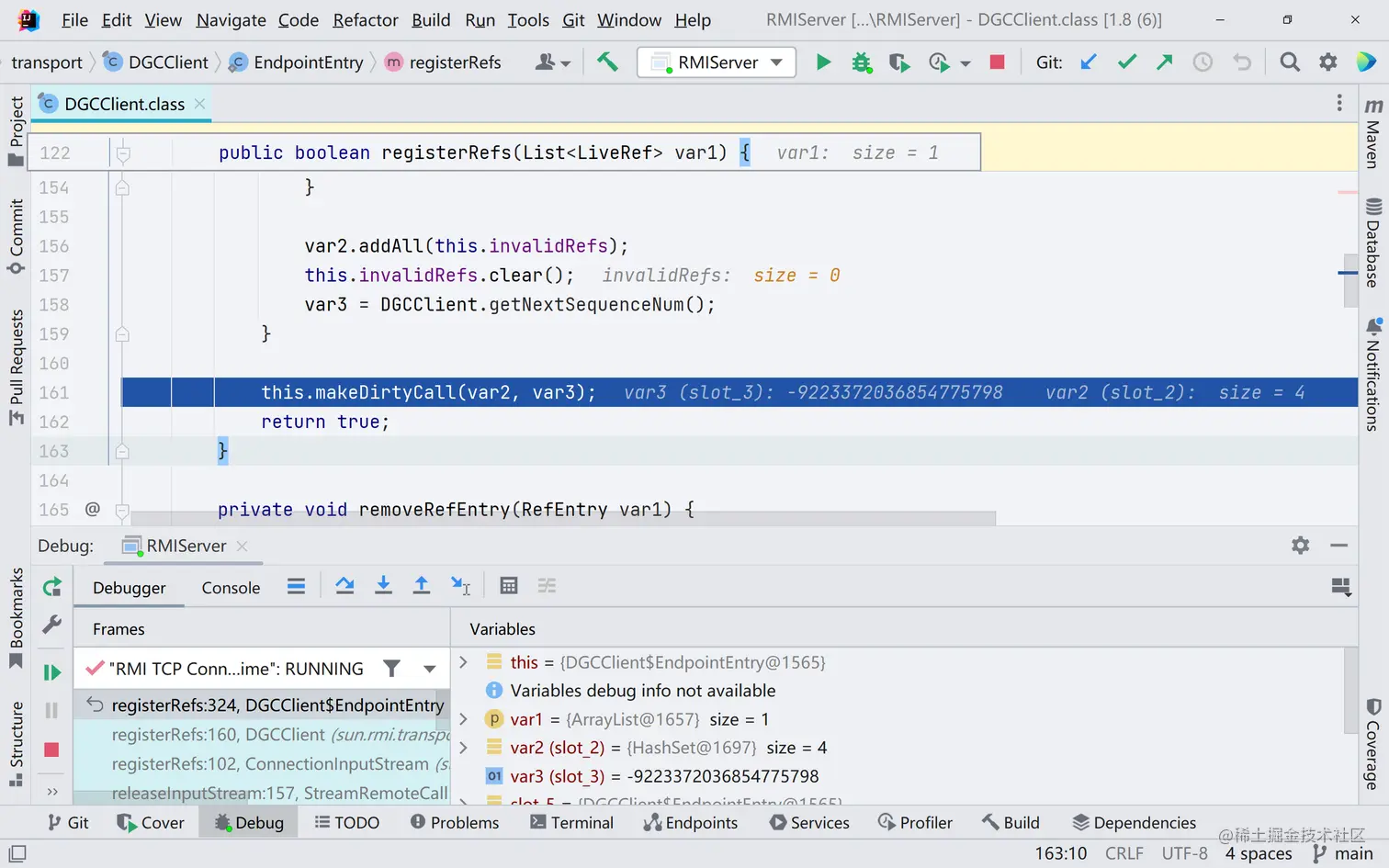 里面主要是做了数据处理,将原本保存了 EndPoint 的 var1 —— HashSet 数组转换为 ObjID,同时,调用了 this.dgc.dirty() 方法,跟进。