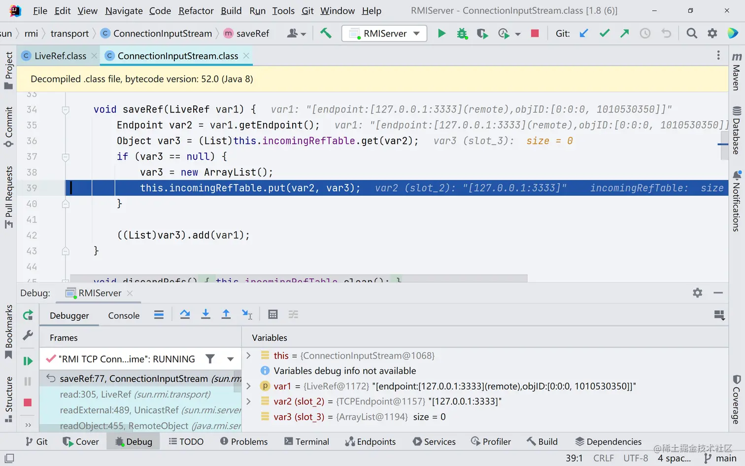 跟进 saveRef() 方法,里面做了一个映射,其建立了一个 TCPEndpoint 到 ArrayList<LiveRef> 的映射关系。