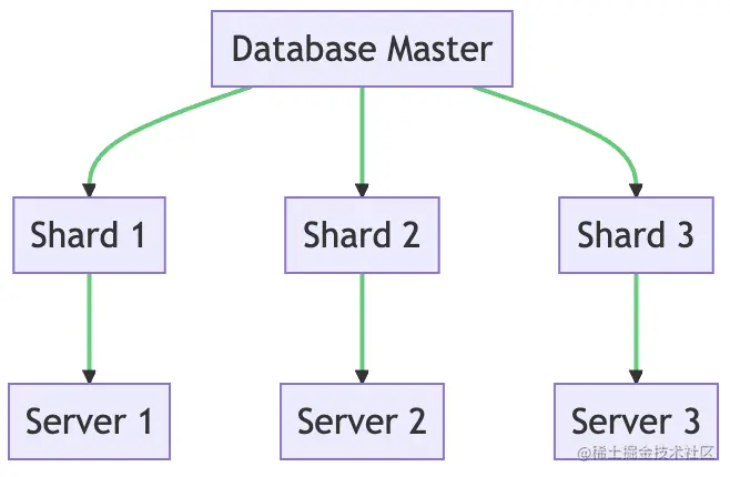 上面的图表展示了一个分片数据库的可视化表示。主数据库被分割成更小的分片,每个分片都存储在不同的服务器上。