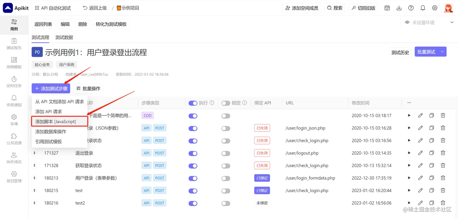 在流程测试用例界面,进入用例管理,点击 添加脚本[Javascript] 按钮: