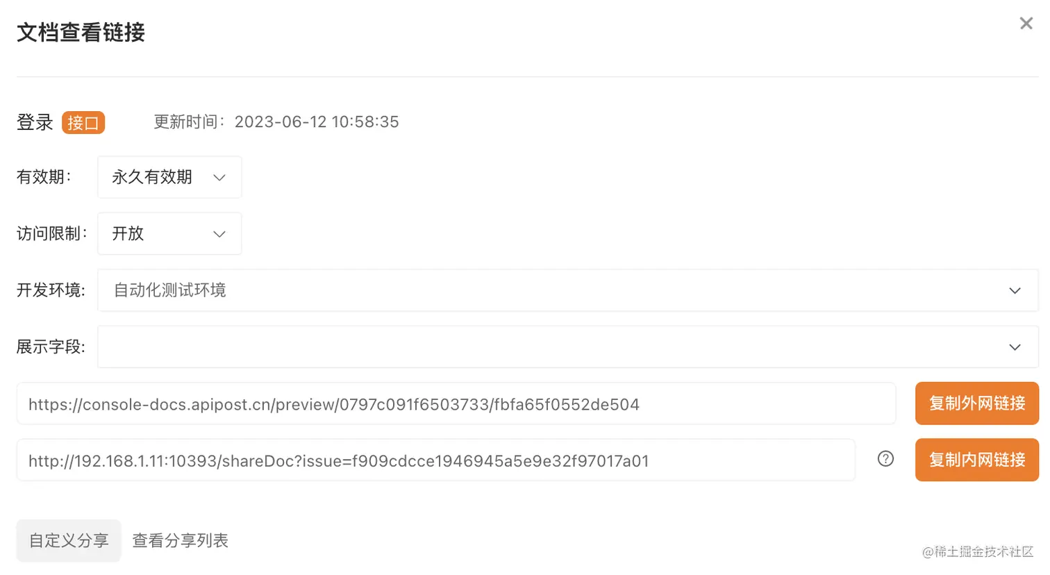 一键快速生成文档: 简化接口文档撰写,提高效率。填写接口参数后,点击“分享文档”按钮即可自动生成漂亮、规范的文档,支持自定义分享有效期和权限。