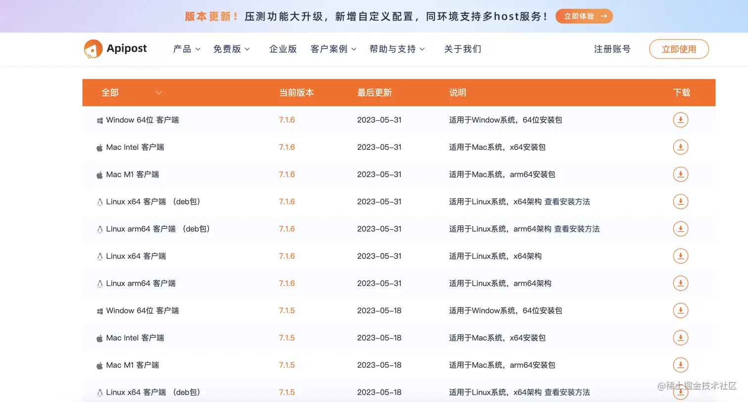 Apipost支持Windows、Linux、Mac等多种环境的多个版本。 可以直接在官网下载对应版本,也可以直接在官网登录使用SASS版