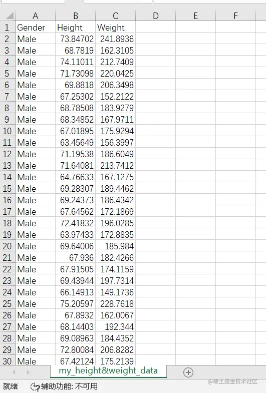从表中可以获知该数据集包括三个标签,即“gender”,“height”,“weight”,其中“height”项作为自变量H(输入),“weight”为因变量W(输出),建立一元线性回归模型 W = a H + b W=aH+b W = a H + b 进行数据拟合,python实现过程如下:
