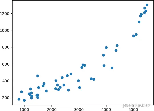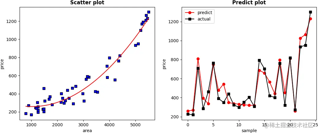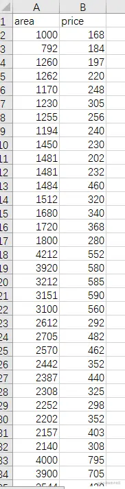一元二阶多项式,简单说即 y = a x 2 + b x + c y=ax^2+bx+c y = a x 2 + b x + c 。我们有一批关于房屋建筑面积和成交价格的数据集,我们需要做的是采用合适的方法拟合这些数据得到一个模型,通过该模型输入一个任意 area 可以预测到 price。数据集如下表,信息包括房屋的面积 area 以及对应的成交价格 price 两个属性,由此可推断该问题是一个一元回归问题,一元回归方法包括线性回归或多项式回归,但究竟应该使用哪一种方案对房屋价格进行预测更加适合呢?