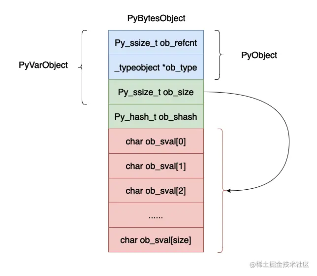 可能你会有疑问上面的结构体当中并没有后面的那么多字节啊,数组只有一个字节的数据啊,这是因为在 cpython 的实现当中除了申请 PyBytesObject 大的小内存空间之外,还会在这个基础之上申请连续的额外的内存空间用于保存数据,在后续的源码分析当中可以看到这一点。源码获取:www.jnpfsoft.com/?from=jueji…