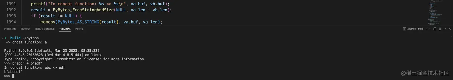 在 python 当中执行下面的代码就会执行字节拼接函数:
