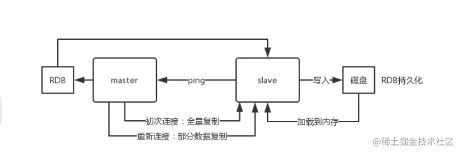 当启动一个slave node的时候,它会发送一个PSYNC命令个master node,如果这是slave node初次连接到master node,那么会触发一次full resynchronization全量复制。此时master会启动一个后台线程,开始生成一份RDB快照文件,同时还会将从客户端新收到的所有写命令缓存在内存中。RDB文件生成完毕后,,master会将这个RDB发送给slave,,slave会先写入磁盘,然后再从本地磁盘加载到内存中,接着master会将内存中缓存的写命令发送到slave,slave也会同步这些数据。slave node如果跟master node有网络故障,断开了连接,会自动重连,连接之后master node仅会复制给slave部分缺少的数据。从Redis2.8开始,支持了主从复制的断点续传,