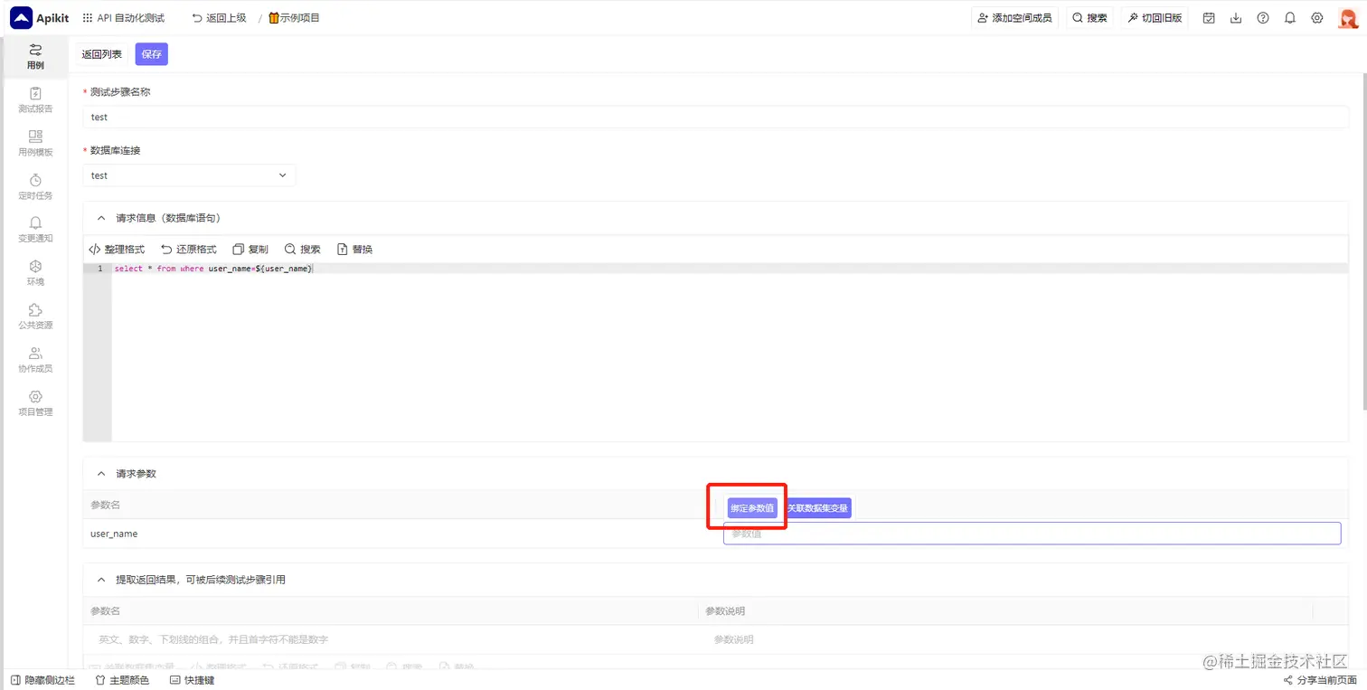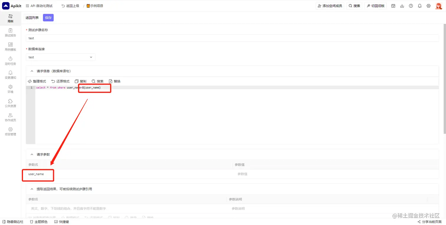 您可以在SQL语句中输入特定的格式 ${参数名} 作为变量,系统会自动识别变量并生成参数的映射表显示在SQL语句输入框的下方,可以在输入框中填写参数、引用其他步骤的参数或者引用测试数据。