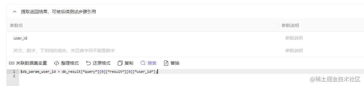 因此我们为user_id 参数添加赋值语句即可:$db_param_user_id = db_result[“query”][0][“result”][0][“user_id”];