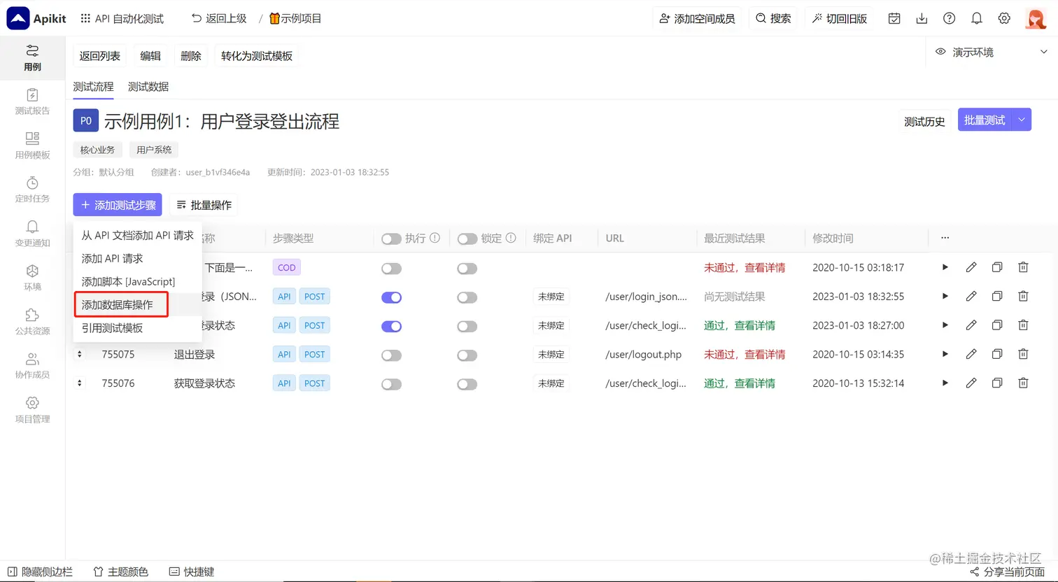 进入自动化测试用例详情页面,点击添加测试步骤下拉菜单,选择 新建数据库操作 :