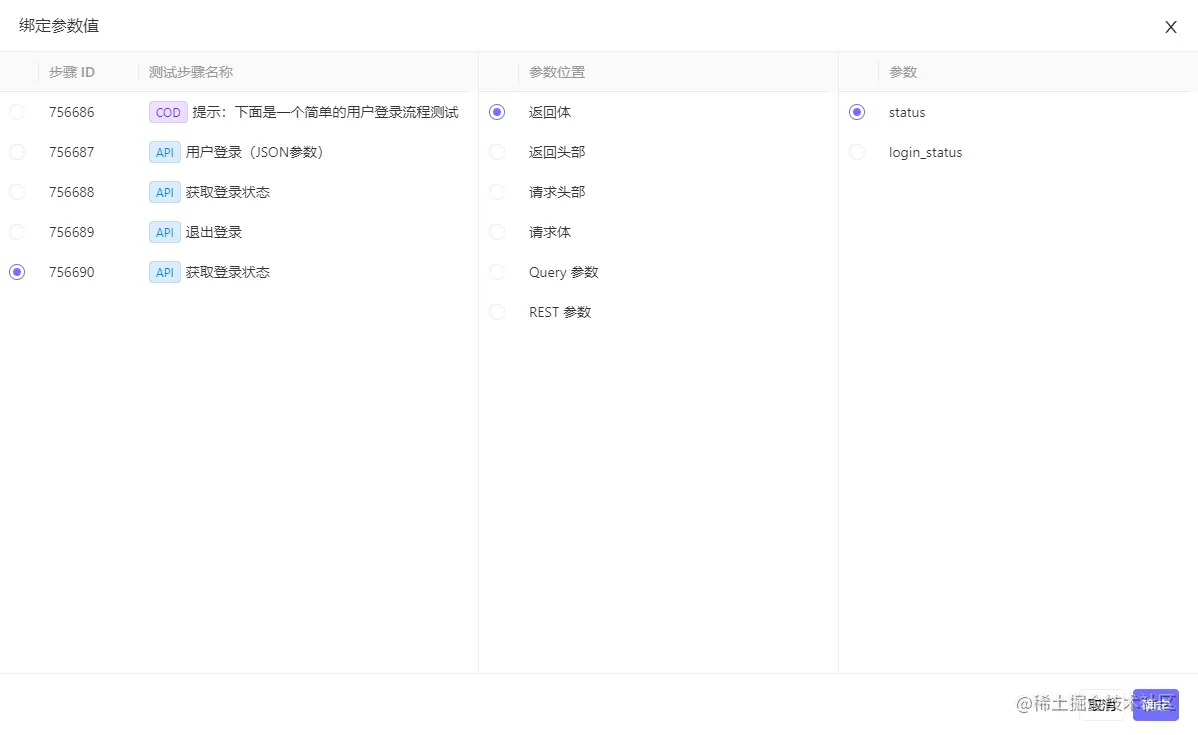 鼠标放置在参数值的输入框上时,会自动显示绑定其他步骤参数和关联数据集变量的按钮,您可以点击绑定按钮为该参数进行绑定,实现动态传参的效果: