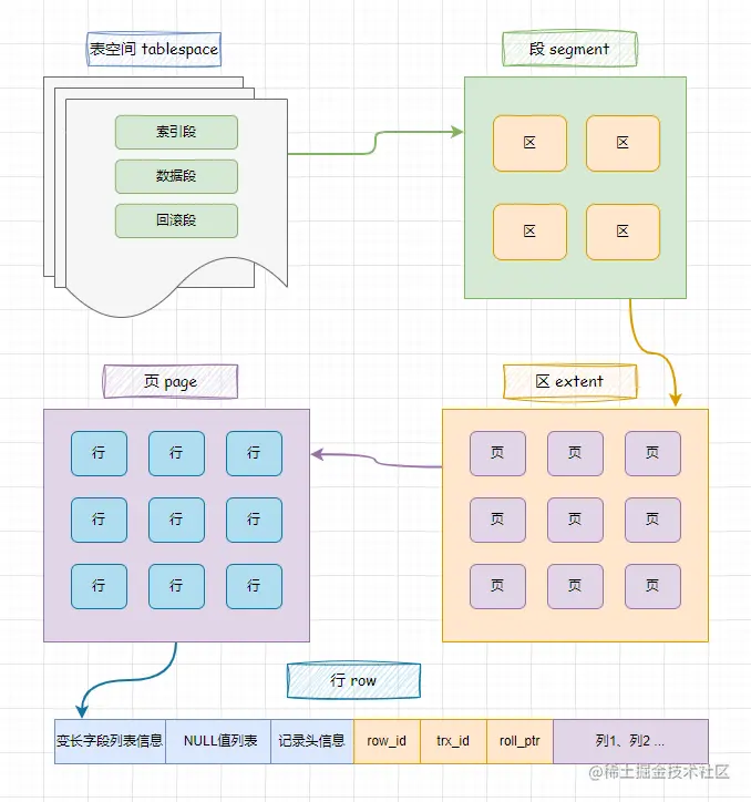 也就是说InnoDB 对 B+ 树的叶节点和叶子节点进行了区别对待,也就是说叶子节点有自己独有的区,非叶子节点也有自己独有的区,如果不区分叶子节点和非叶子节点,统统把节点代表的页面放到申请到的区中的话,进行范围扫描的效率就大幅降低,而不同的区的集合就组成了不同的段。