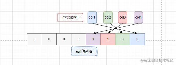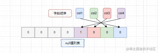 - null值列表是通过bit位来进行标识的,一个字段占一个比特位,bit位按字段逆序排列