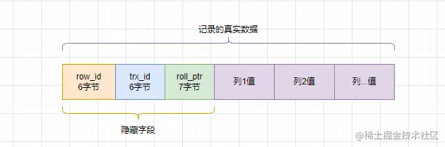 我们看隐藏字段 row_id、trx_id、roll_ptr 感觉是不是在哪里遇到过,只要你了解过Mysql的MVCC机制就很熟悉这几个字段