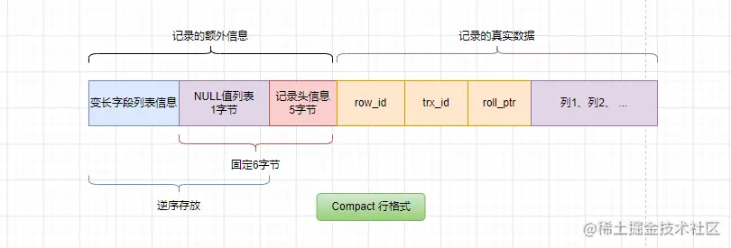 从图中我们可以看到Compact行格式下,一条记录分为 【记录的额外信息】和【记录的真实数据】两部分,我们的列数据是在真实数据部分,我们再分别对这些内容进行更具体的描述。