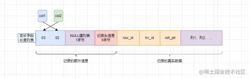 针对VARCHAR、TEXT、BLOB这类变长字段,列中实际存储了多少数据是不固定的,因此除了要把数据本身存下来,还需要记下它的长度,COMPACT将变长列的实际长度按照字段的顺序,逆序存储在变长字段长度列表里。