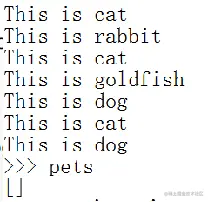 2、一个列表中保存了一个动物列表数据pets = ['dog', 'cat', 'dog', 'goldfish', 'cat', 'rabbit', 'cat'],如何依次弹出列表的最后一个元素,输出示例