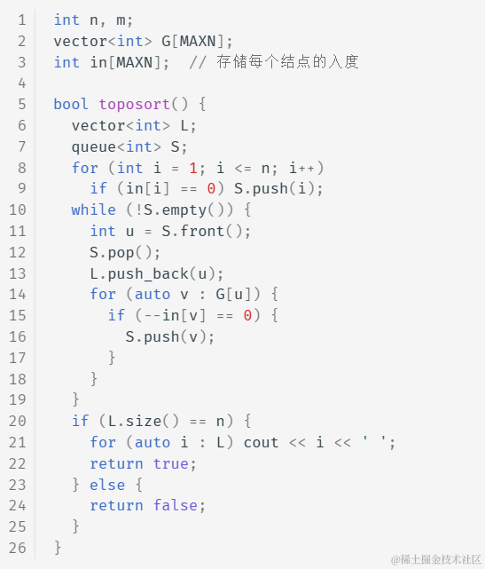 如果所有点都进过队列,则可以拓扑排序,输出所有顶点。否则输出-1,代表不可以进行拓扑排序。