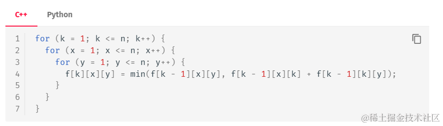 - f[k][x][y] = min(f[k-1][x][y], f[k-1][x][k]+f[k-1][k][y])(f[k-1][x][y],为不经过 k 点的最短路径,而 f[k-1][x][k]+f[k-1][k][y],为经过了 k 点的最短路)。