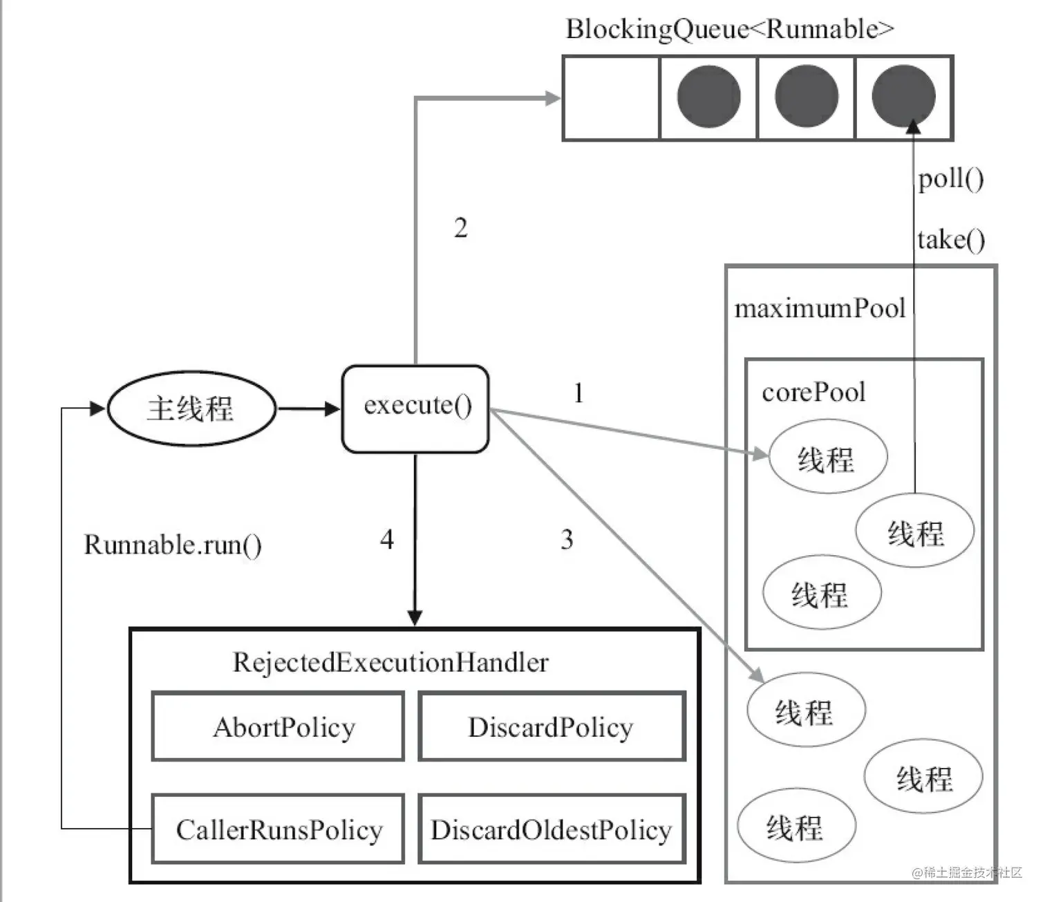 当然,也可以根据应用场景需要来实现RejectedExecutionHandler接口自定义策略。如记录日志或持久化存储不能处理的任