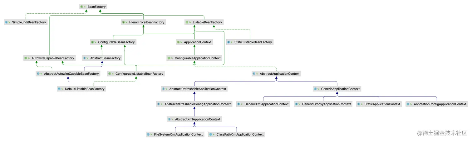 - DefaultListableBeanFactory:这个默认实现了 ListableBeanFactory 和 BeanDefinitionRegistry 接口,是一个比较成熟的 BeanFactory。
