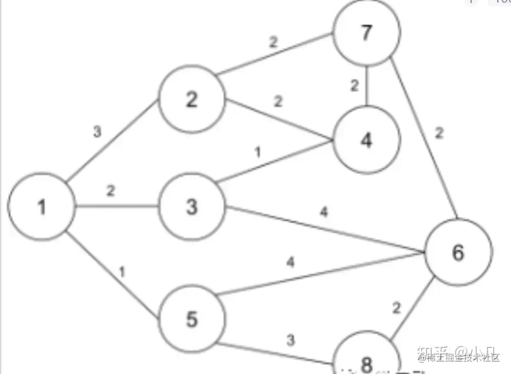 **7、**给定一个如下所示的图,图中的边代表了两个节点间的距离。如果使用迪杰斯特拉算法对节点 1 和节点 8 求最短路径,则当完成计算时,算得节点1 到节点 8 的最短路径是?同时当完成节点 1 到节点 8 的最短路径计算时,节点 1 到哪些节点(除了 1 和 8 )的最短路径也已经计算完毕?( )