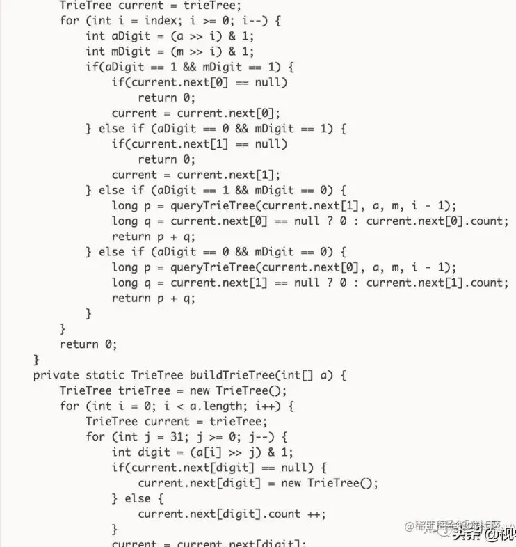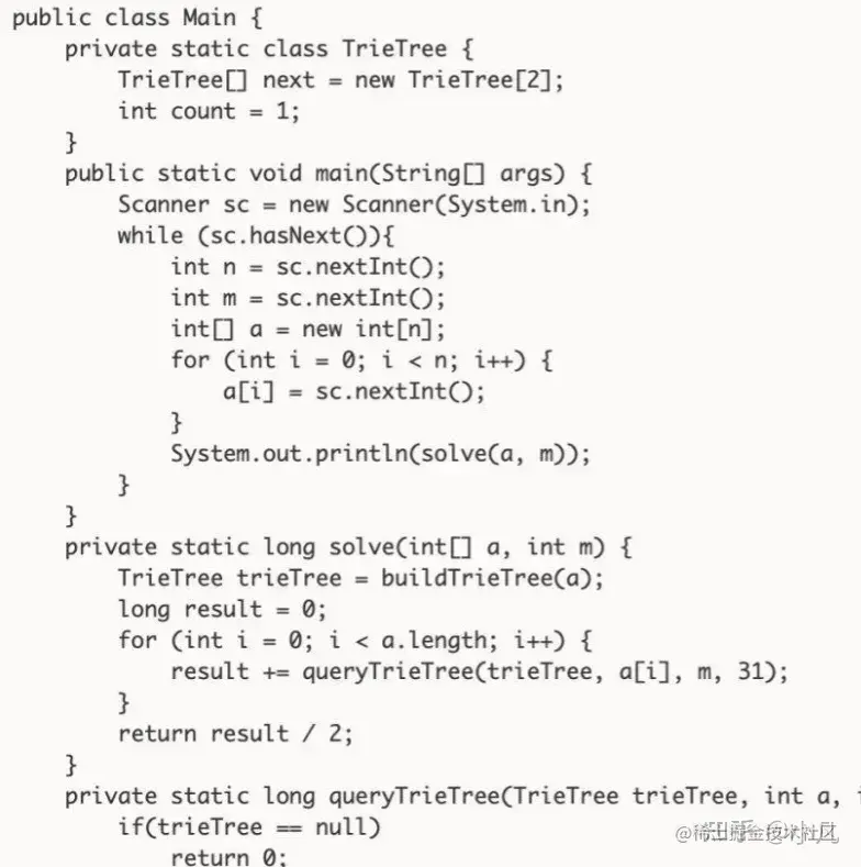 由此,考虑使用字典树(TrieTree)从高位到第位建立字典,再使用每个元素依次去字典中查对应高位异或为1, 而m为0的数的个数,相加在除以2既是最终的结果;直接贴出代码如下,非原创,欢迎讨论;