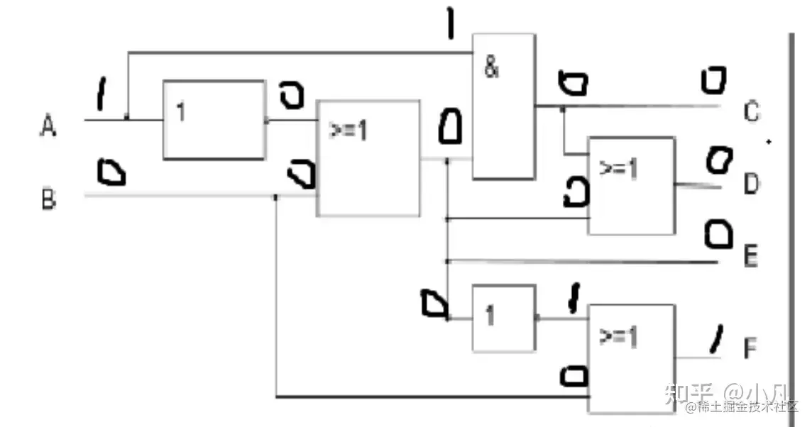 现在对以下的电路中的 A 和 B 引脚分别持续输入一个高电平( 1 )和一个低电平( 0 ),问最终电路的引脚 C 、 D 、 E 、 F 分别输出的电平是什么?