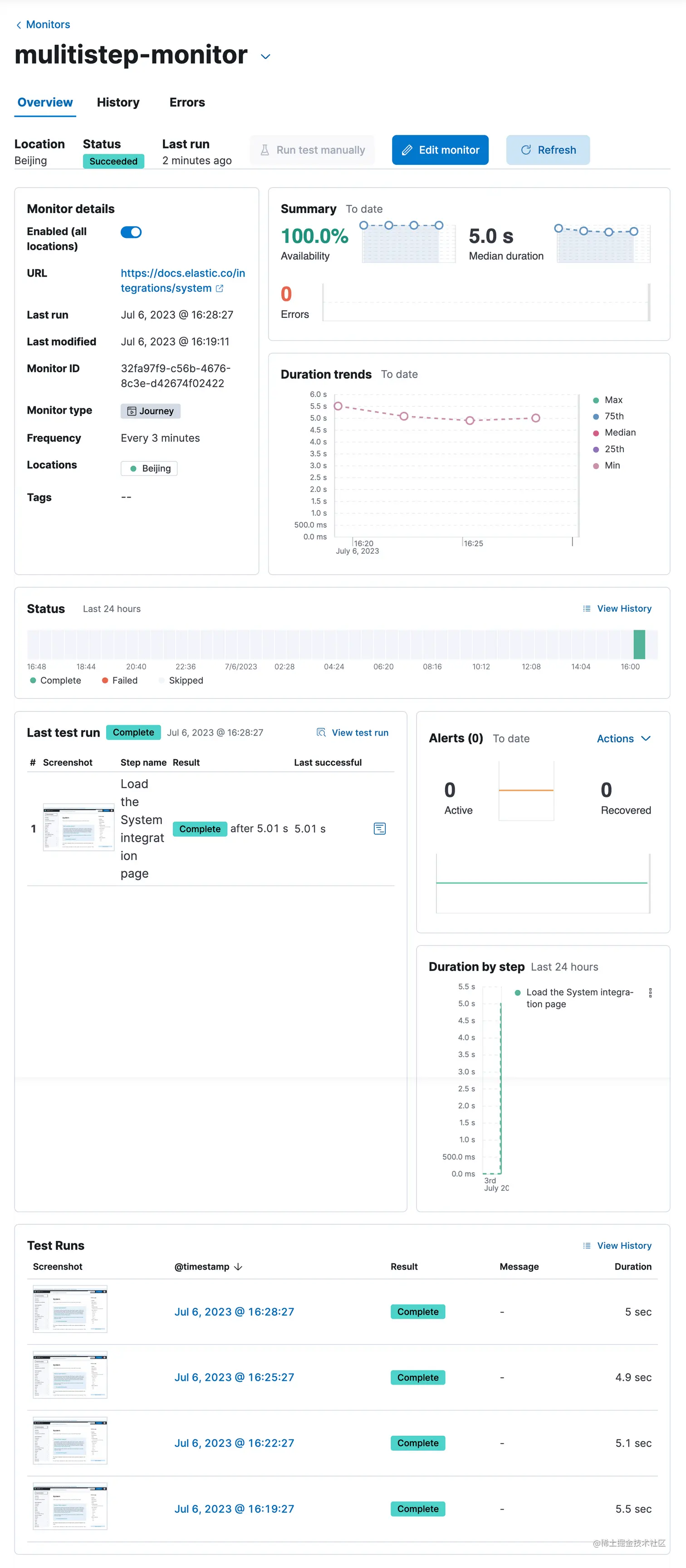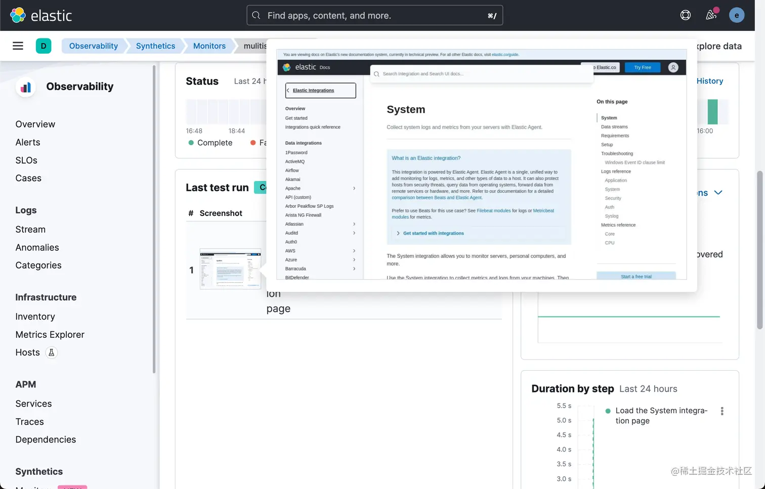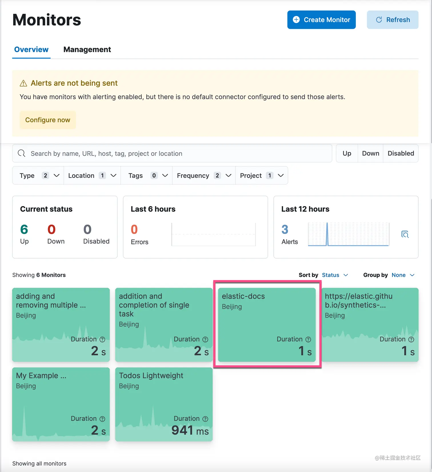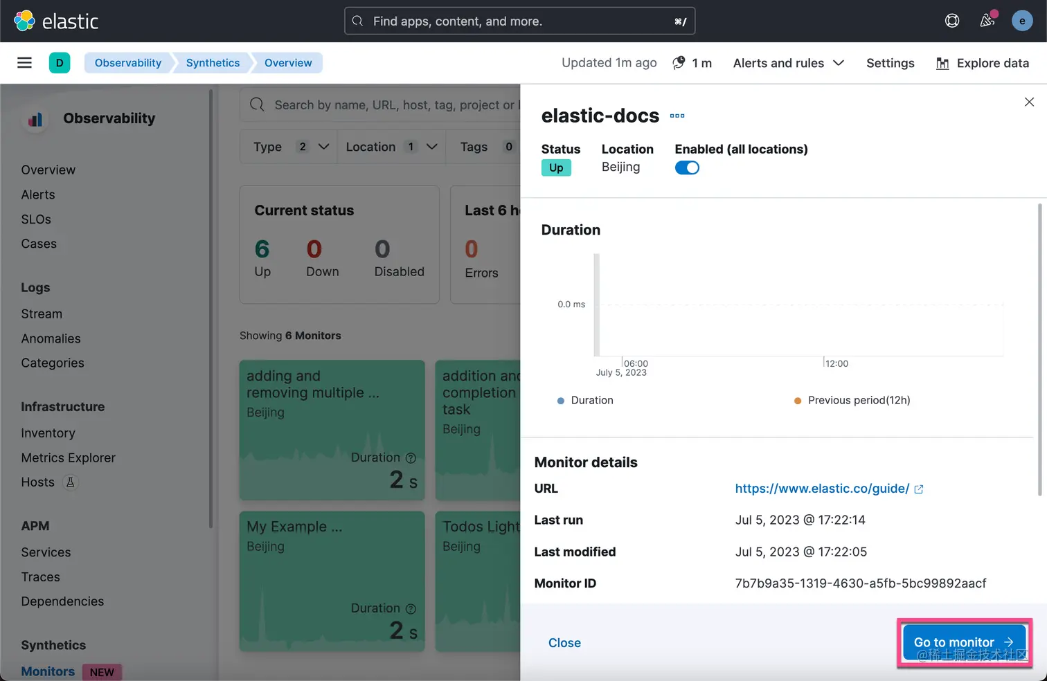 我们可以看到一个新生成的 elastic-docs 的监控: