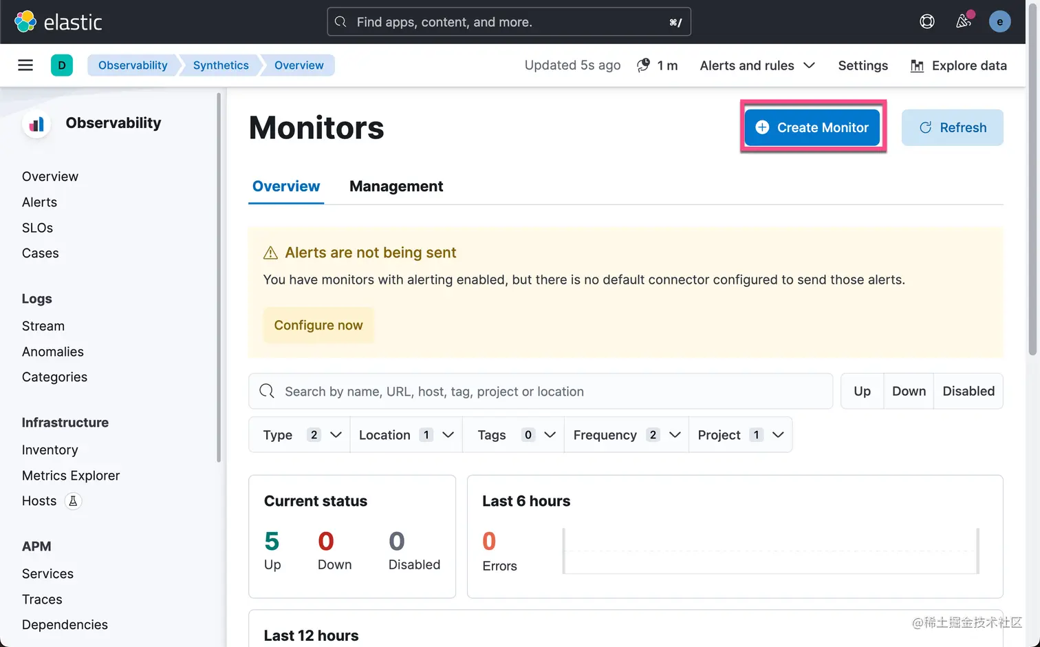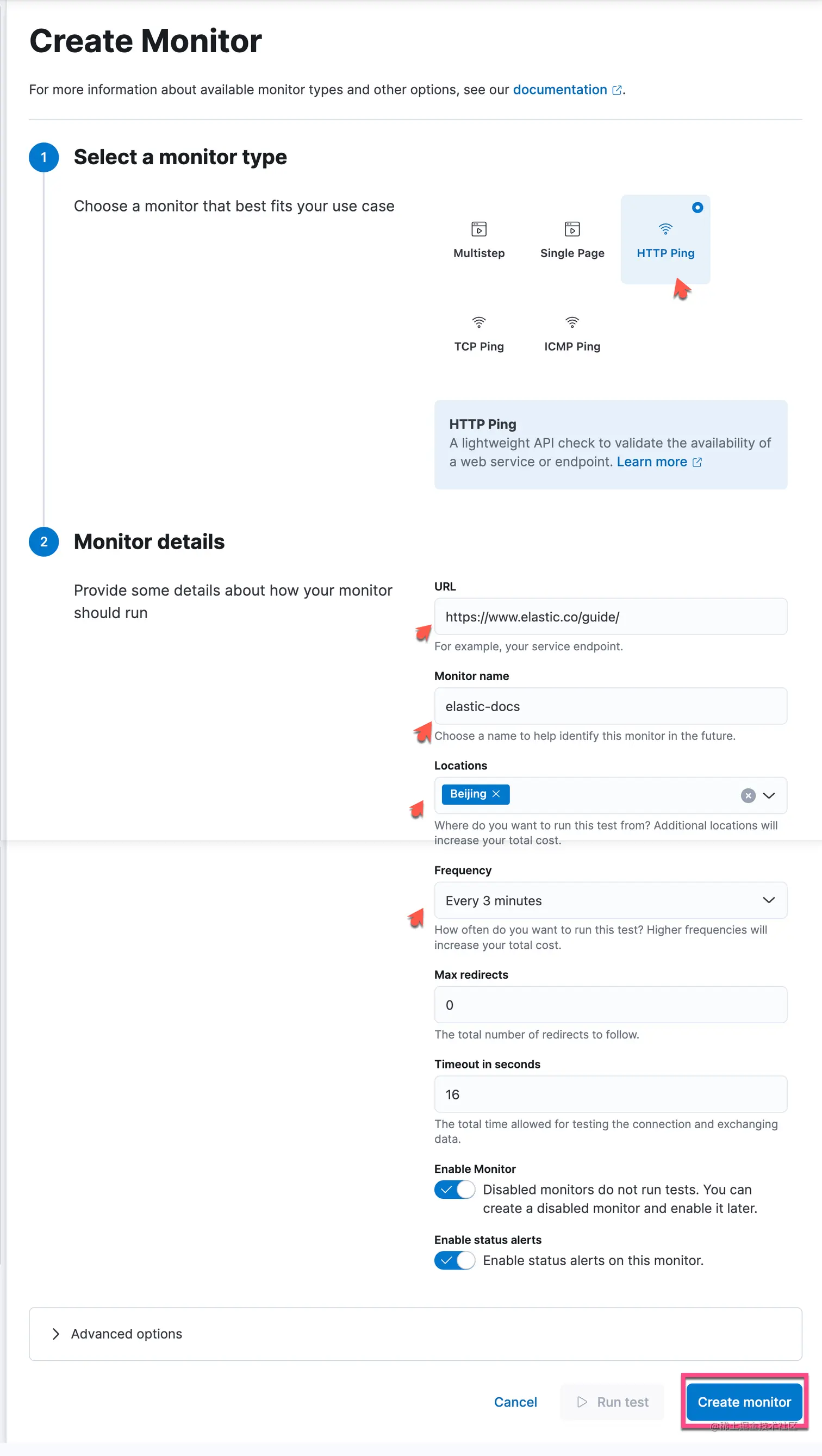 如果你选择的是公有的位置(由 Elastic 托管的位置),那么你可以选择 “Run test” 来进行测试。点击上面的 Create monitor: