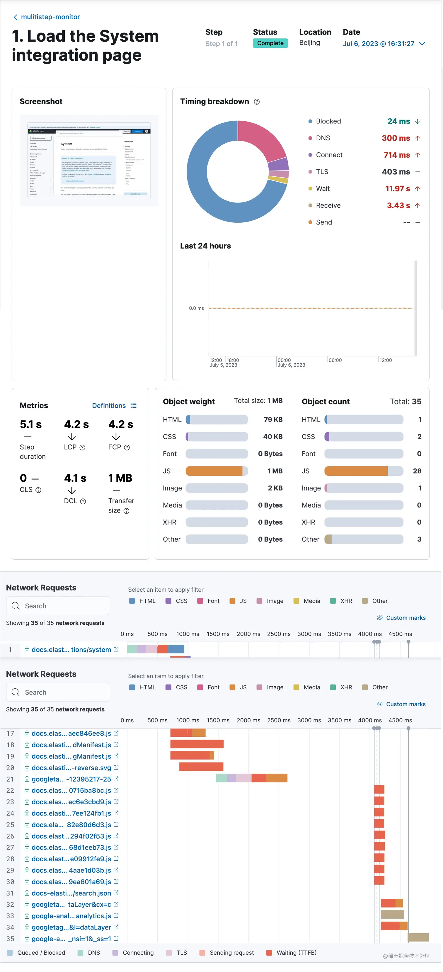 从上面的输出中,我们可以清楚地看到每次测试的页面截图,同时,我们也可以可以看到每次页面显示时,它花去的时间在哪里。