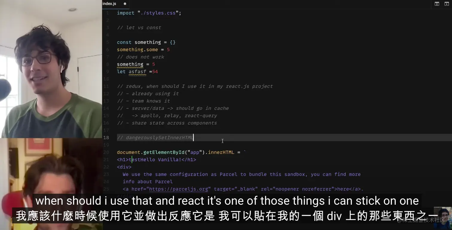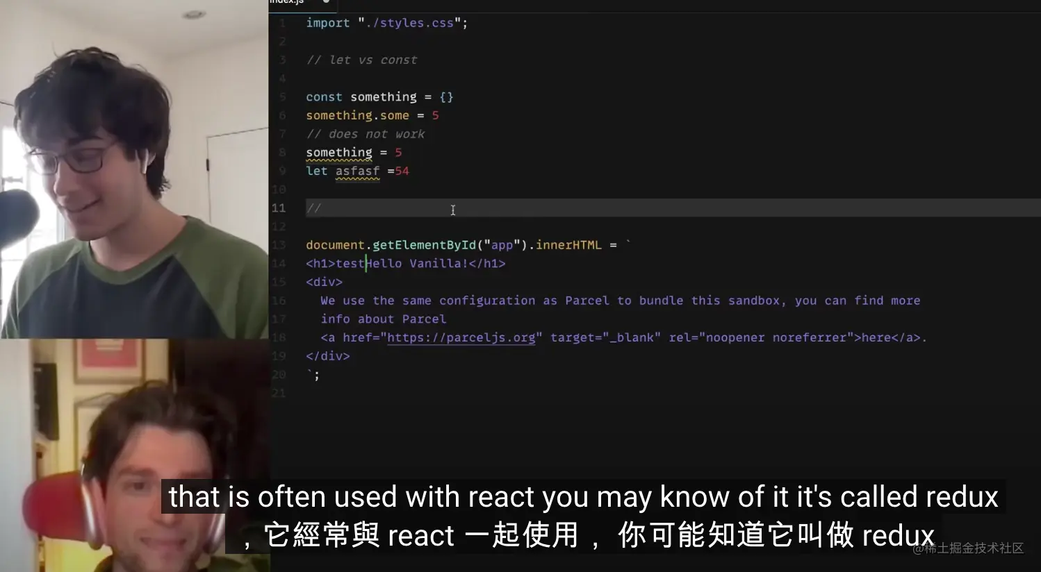 上来就是国内也很经典的一道面试题,让 Dan 回答 let 和 const 的区别。