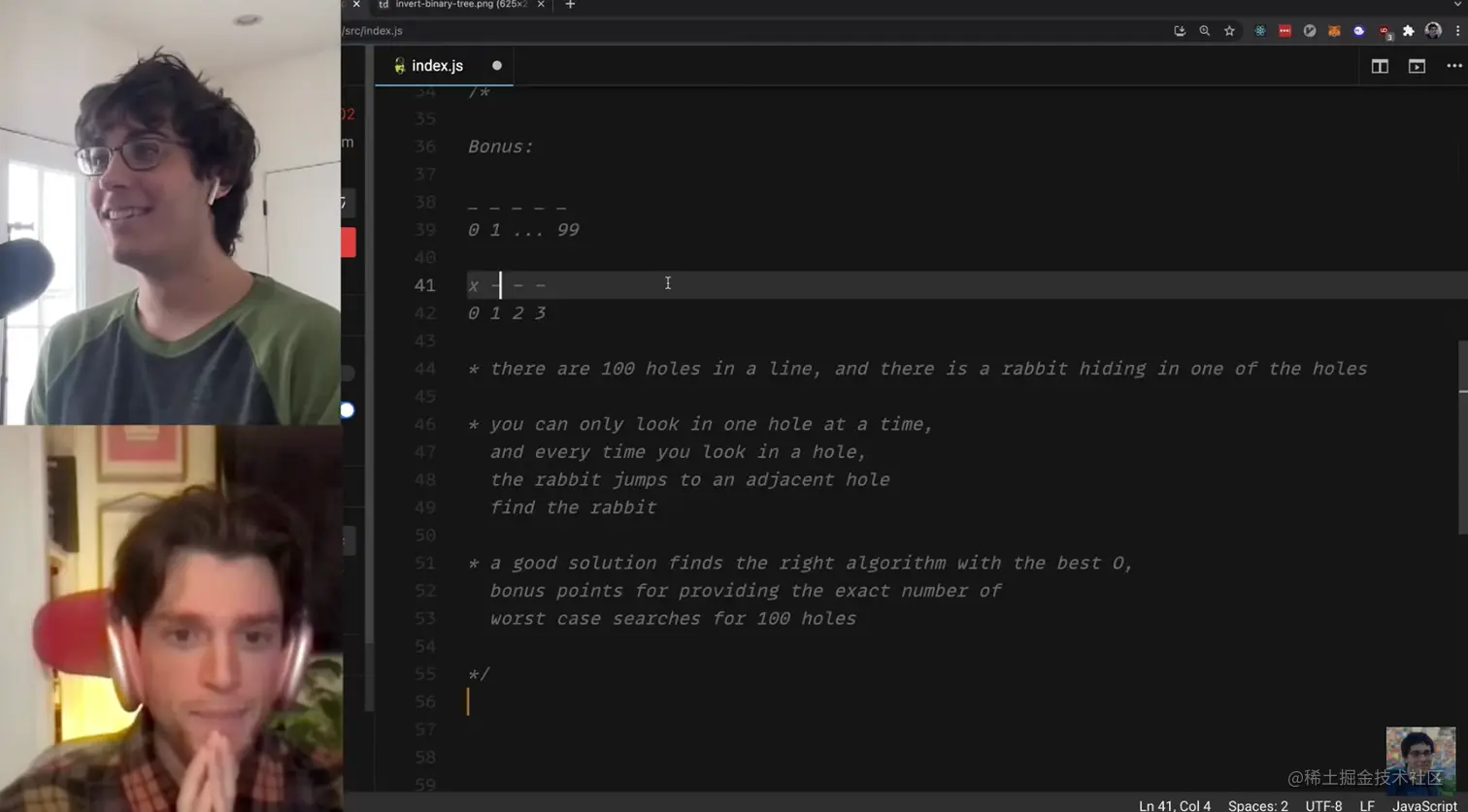 这是一个比较开放性的问题,具体 Dan 调试和解答的过程可以直接去看原视频,占据了整整二十多分钟时间。这题是真的有难度了,不过 Dan 会把他思考的过程转化成代码或者文字写在 IDE 里,帮助自己找到更多线索,并且不断的和面试官进行沟通来确认细节,我觉得这是非常值得学习的。