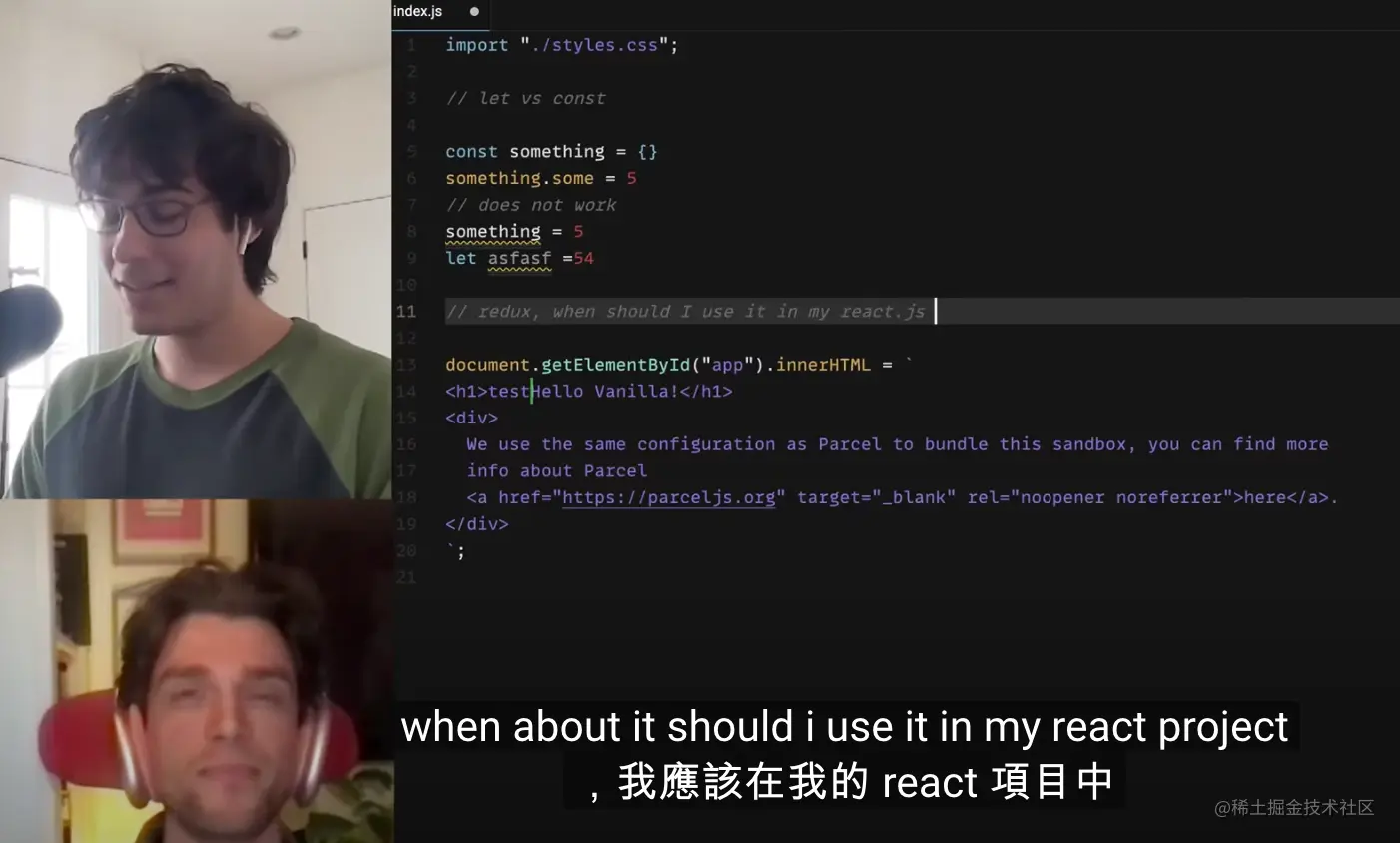 最后 Dan 说,如果现在新建一个项目,他可能不会选择 Redux 了,主持人蛤蛤大笑,问他会选择什么,Dan 说这取决于实际情况,如果是一些需要缓存的服务端数据,他可能会选择 react-query, relay, apollo 等一些现代的 react 请求状态库。
