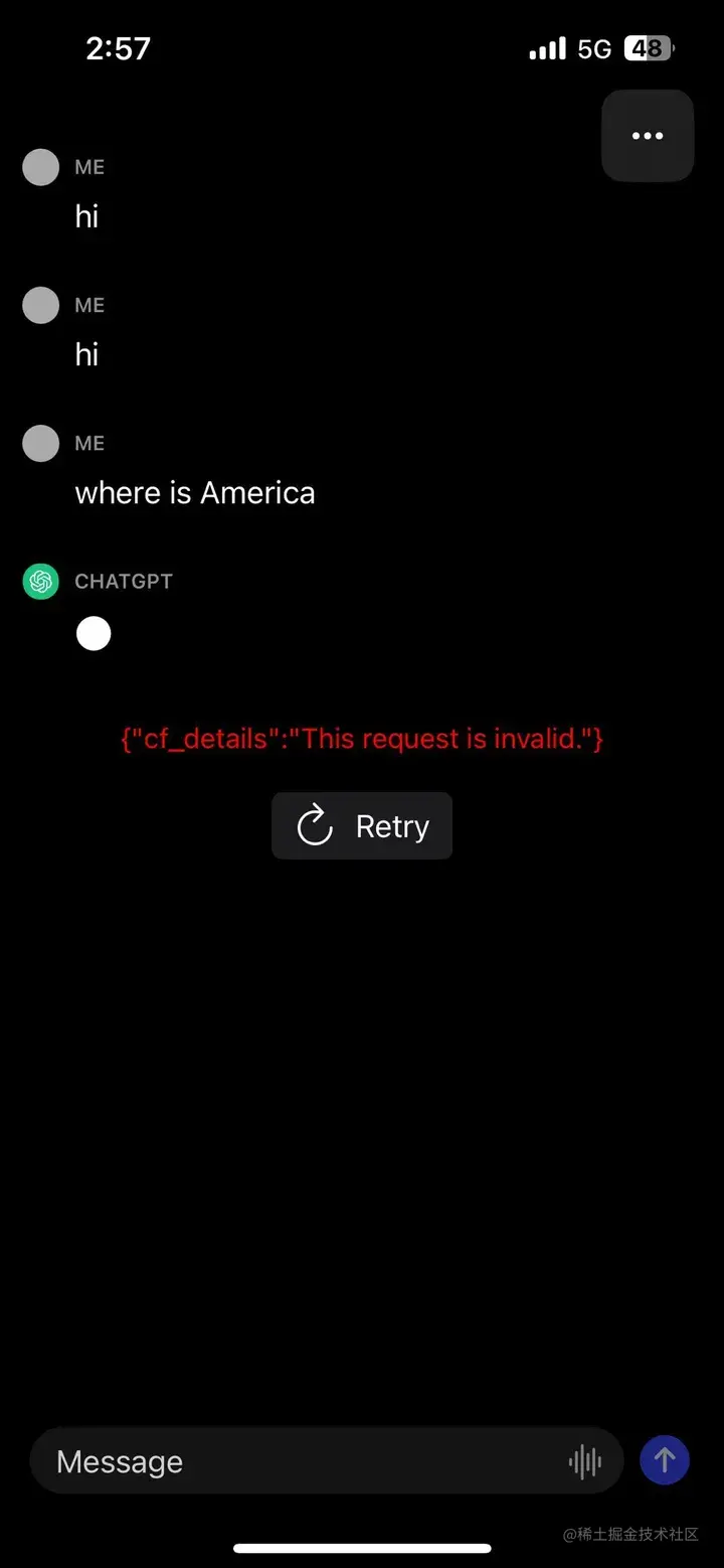 最近在苹果AppStore下载了ChatGPT客户端,登陆ChatGPT时发送对话提示{“cf_details”:”This request is invalid.Try again later.”) Retry……