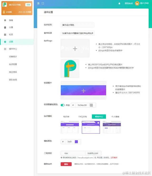 站点设置:进入站点后台设置站点logo、banner、模版、颜色、二级域名.....