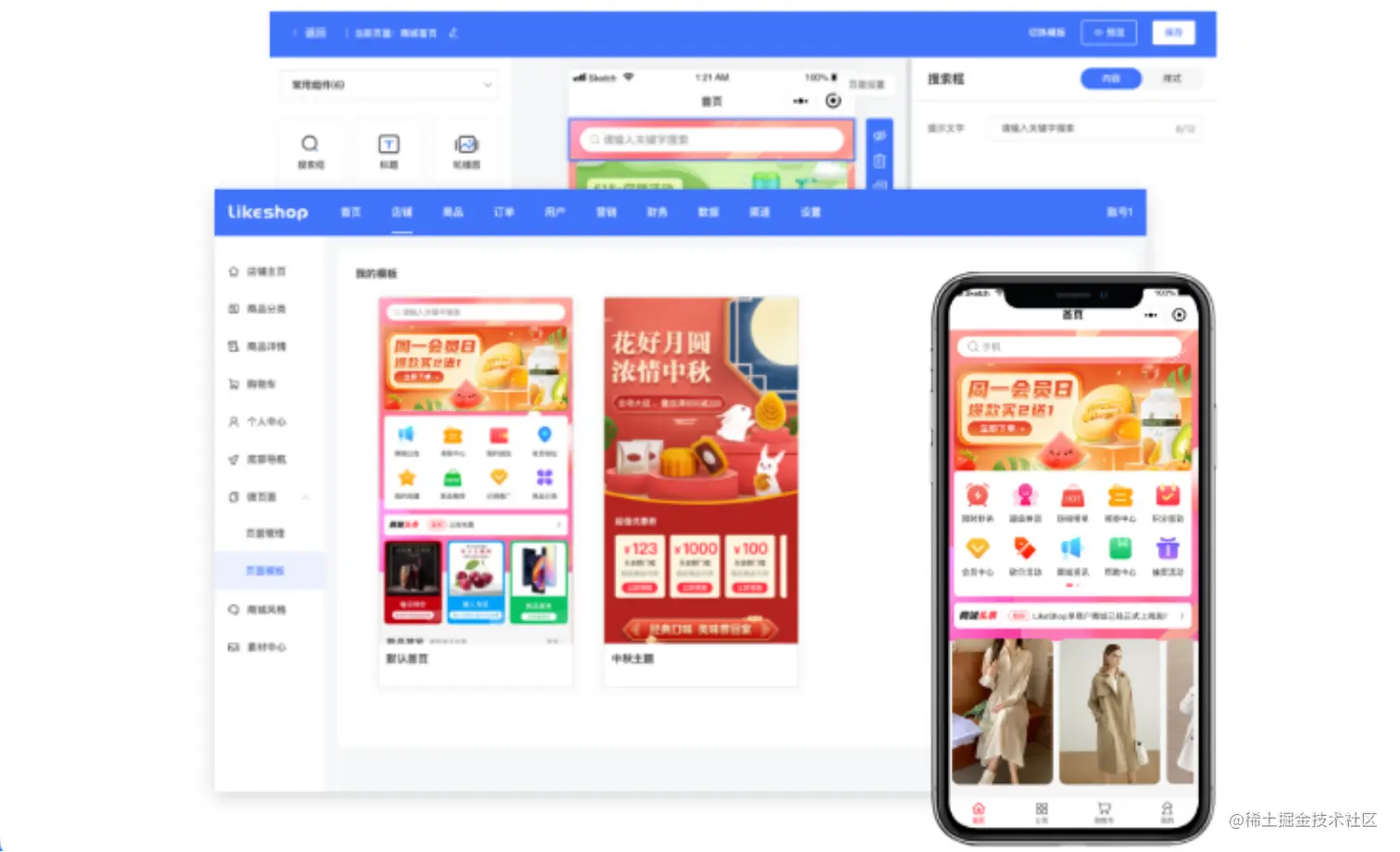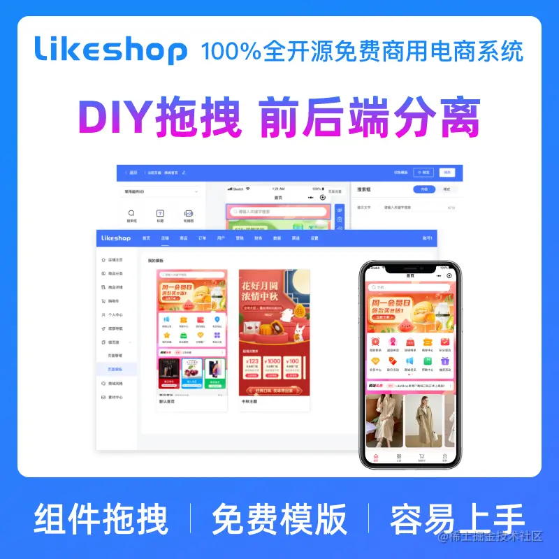 后台采用前后端分离,商城页面支持DIY拖拽、提供免费模板、简单易用,提高用户体验