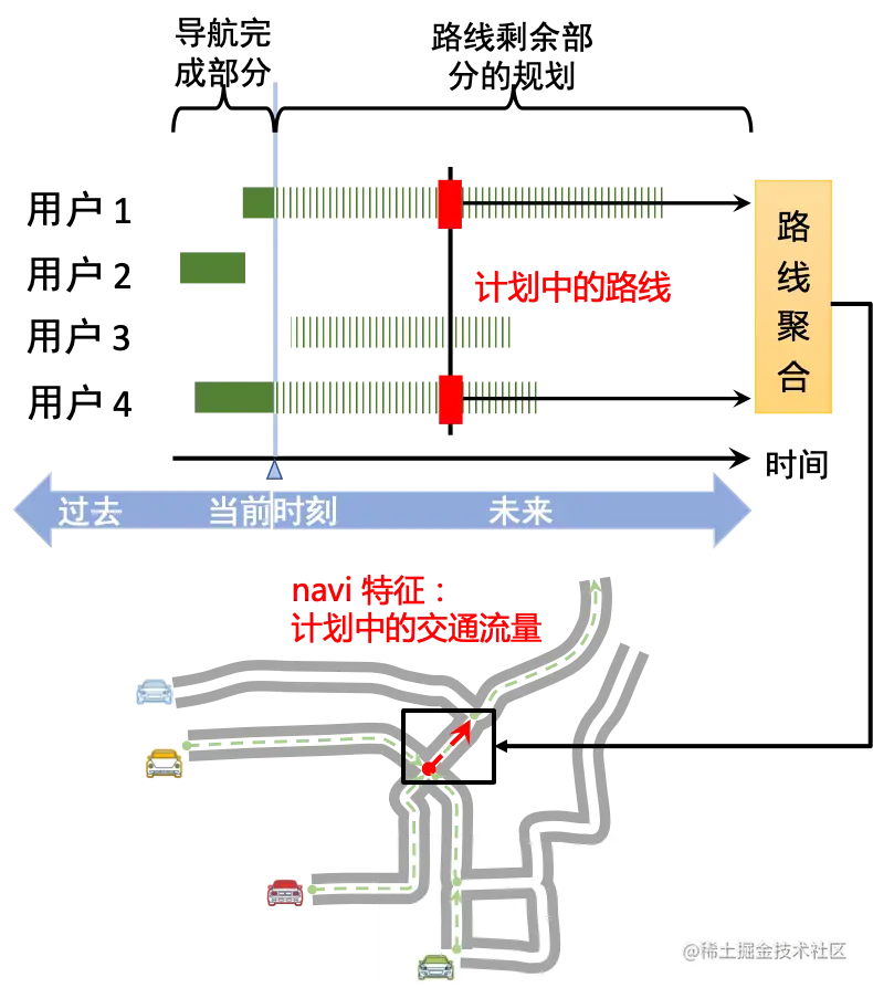 我们注意到,由于用户A出发很早,出发时刻全程路况仍非常畅通,此时各个link流量也基本和8月无区别。这样,想要让模型能预判未来会出现比往常严重很多的拥堵,就必须引入能在用户出发时刻就与8月相同时间有明显区分度的特征。用户A的例子中,在他刚刚出发时,北五环上车流很小,但已经有很多像他一样早起且需要走北五环的用户开着导航从家里出发了,这些人虽然还没有上五环,但只要他们不偏航且完全按照ETA预估的时间行进,那么未来任意时刻这些用户的位置我们都可以推算得到,这意味着我们可以统计“未来的交通流量”。也就是说,这些已经在导航中的用户,未来各个时间片上会在北五环的各个link上分别形成多大的交通流量,都可以统计到(注:这里统计到的流量是匿名的聚合总量)。如图4所示,我们把这个统计量称作“未来的交通流量”特征。上面的例子中,早上6点,有很多需要上北五环的用户已经出发了,因此此时五环上的link已经显著高于8月份。