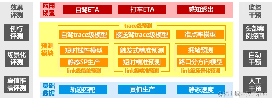 效果评测层面,涉及到自身link级、trace级基础指标评测,对真值推演结果的评测、各个场景的效果评估。监控干预层面,涉及到实时捞取头部问题case、对问题link的ETA进行自动干预、人工干预等。