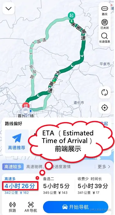 **ETA(Estimated Time of Arrival),即预估到达时间,指的是用户在当前时刻出发按照给定路线前往目的地预计需要的时长。**如图1展示了驾车ETA在导航软件的前端页面上呈现的形态,用户在使用过程中会主要参考这一数据安排行程时间、进行出行相关决策;对于打车的场景,平台呈现给用户的预估价也基于这一数据进行计算。因此,如何准确地预估ETA对于高德地图的诸多业务板块都起到至关重要的作用。