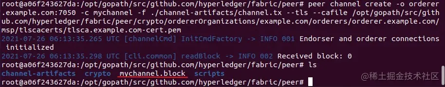 这个命令执行完成后将返回一个区块(名称与我们定义的通道 ID 有关,<channel-ID.block>)。在 fabric 中,所有的操作都是通过交易来体现的,因此当我们执行完这个命令成功发起请求后,最终会以交易的形式上链(存储到某个区块中),这个区块中包含了 channel.tx 中的配置信息,所以我们可以使用它来将节点加入到该通道中。