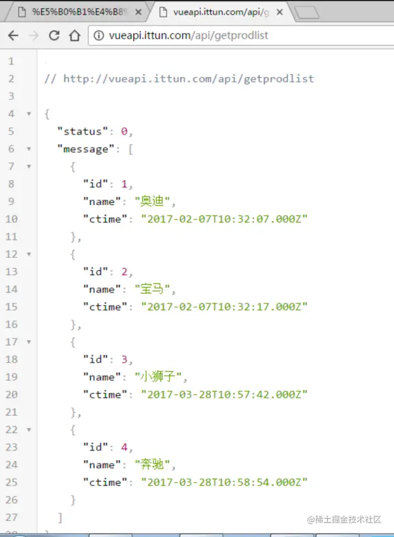 如果我直接在浏览器中输入请求的url,获取的json数据如下:(可以看到,这种方式获取的是相同的数据)