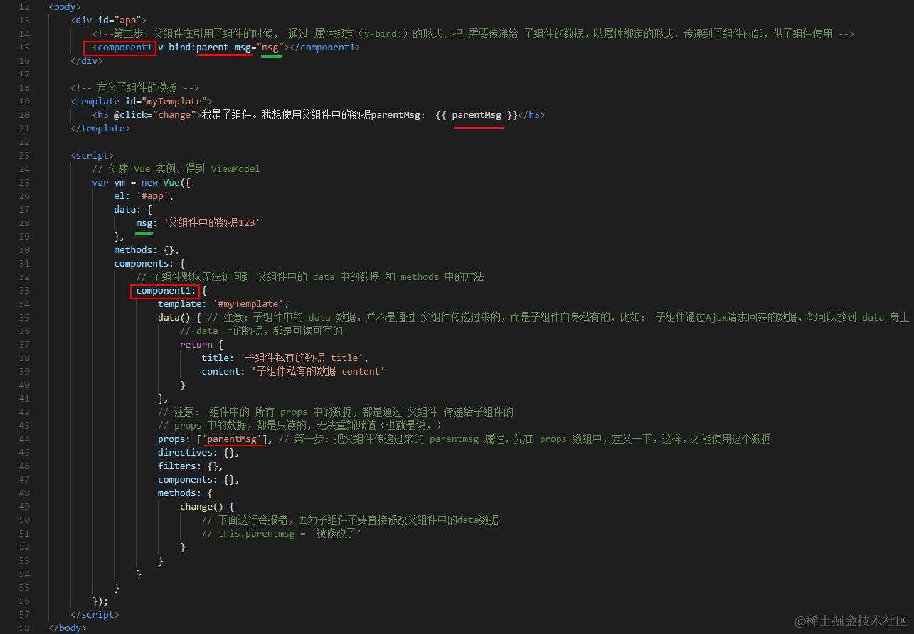props: ['parentMsg'], // 第一步:把父组件传递过来的 parentMsg 属性,先在 props 数组中,定义一下,这样,才能使用这个数据