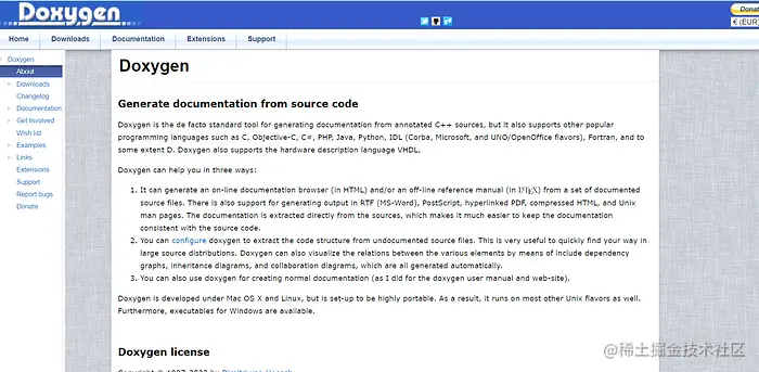 Doxygen 是一种文档工具,支持多种编程语言,包括 C++、Java 和 Python。它从源代码注释中提取文档并生成 HTML、PDF 或其他格式。Doxygen 促进代码文档并帮助开发人员有效地共享他们的工作。
