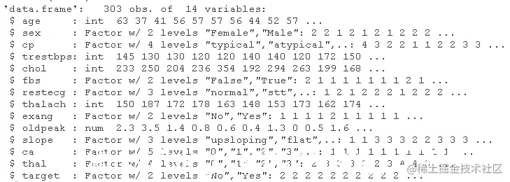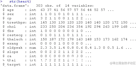 该数据有303个观察值和14个变量。每个观察值都包含关于个人的以下信息。