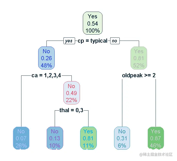 在决策树的帮助下,我们可以说所有变量中最重要的是CP、CA、THAL、Oldpeak。