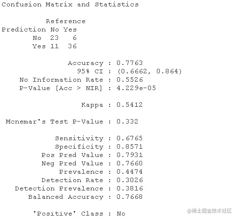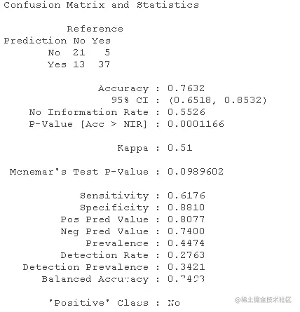 我们可以得出结论,在Naive Bayes算法的帮助下生成的模型准确率为78.95%,或者我们也可以说Naive Bayes算法的错误分类率为21.05%。
