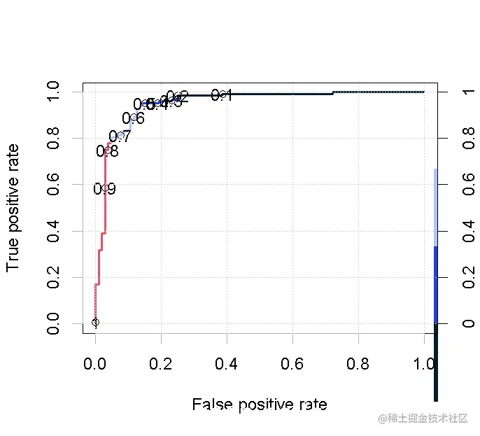 plot(perf,colorize = T,print.cutoffs.at = seq(0.1,by = 0.1))