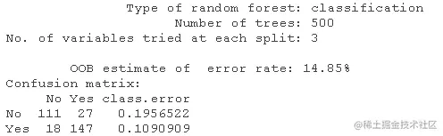 红线代表没有心脏病的MCR,绿线代表有心脏病的MCR,黑线代表总体MCR或OOB误差。总体误差率是我们感兴趣的,结果不错。